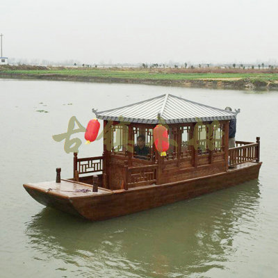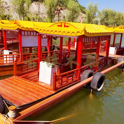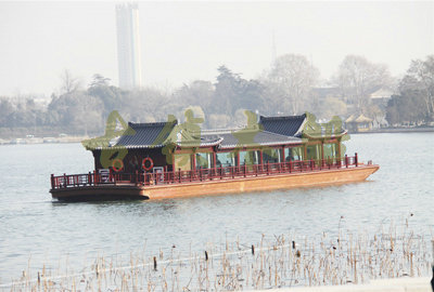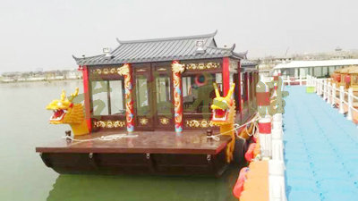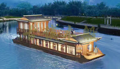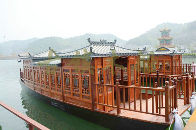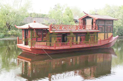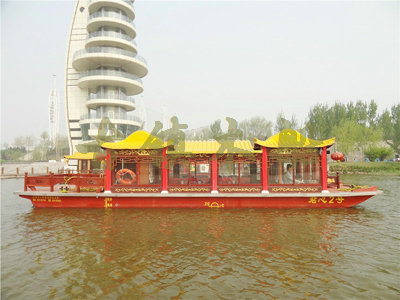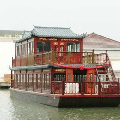 畫舫船就是裝飾古典華麗的游船,是"中國風"的仿古游船,結(jié)合古典園林建筑,體現(xiàn)了中華文明的古典藝術(shù).畫舫船豪華而又古典,船上的建筑按照中國古代建筑里的亭臺樓閣,建筑工藝之復雜,要求之嚴格,仿古畫舫游船的特點飛檐翹角、玲瓏精致的四角亭子逐漸成形,赫然立于船頭,美人靠、盤龍柱子、彩畫……龍柱上的浮雕盤龍和祥云一層扣著一層,層層錯落有致,雕刻精細到盤龍身上的每一個鱗片都細細可數(shù),古代皇家標志性元素,在畫舫船上體現(xiàn)的淋漓盡致。除了雕刻、花窗,整條船還有一個看點,那就是弧線優(yōu)美、高高翹起的船尾。游船并不大,長約10米、寬3米,但是整體看起來堪稱一件藝術(shù)品。船尾的雕花欄桿與船艙、船頭的雕刻遙相呼應,船身四周貼著浮雕祥云,給整條船增添了富貴、華麗的氣質(zhì)。